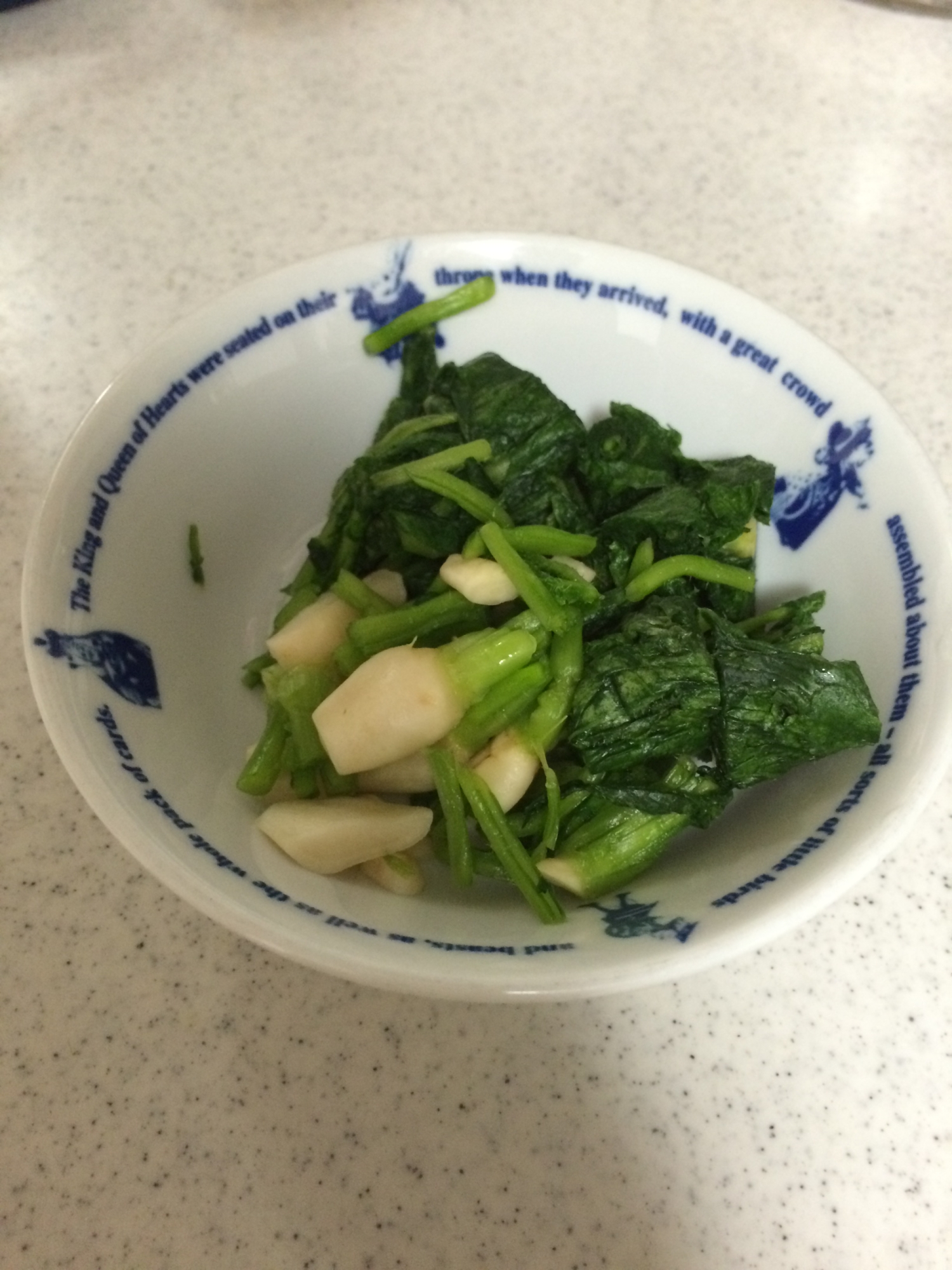 ぼくの休日 かぶの間引き菜と玉ねぎのからしごまみそ和え